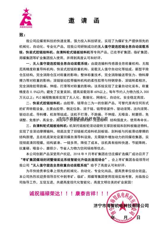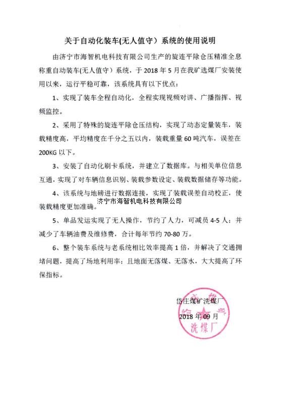 本產(chǎn)品一經(jīng)推出即獲得各大設(shè)計院及用戶的一致好評,率先在棗礦集團岱莊煤礦取得成功應用,2018年9月受邀參加了《棗礦集團煤場封閉暨儲裝運系統(tǒng)智能化升級改造現(xiàn)場會》,智能裝車系統(tǒng)得到了充分肯定!我司憑借雄厚的加工制造實力及過硬的創(chuàng)新技術(shù)能力,勢必為運輸稱重系統(tǒng)、快速計量裝車系統(tǒng)帶來又一次的技術(shù)創(chuàng)新變革。