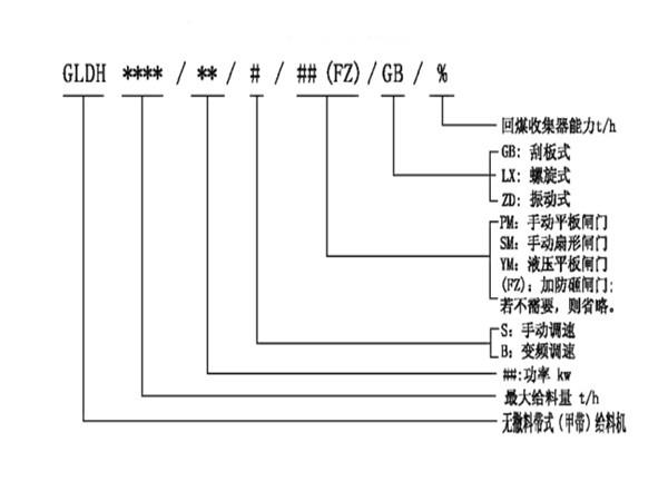 無撒料帶式(甲帶)給料機(jī)型號(hào)說明:
